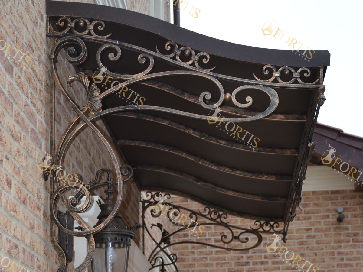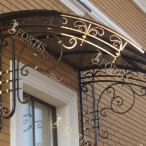 Кованые навесы и козырьки не только защищают Вас от дождя, снега и падения сосулек, но и украсят вход в здание. Интересным и самобытным является конструкция из навеса, лавочек и ограждения – беседка.